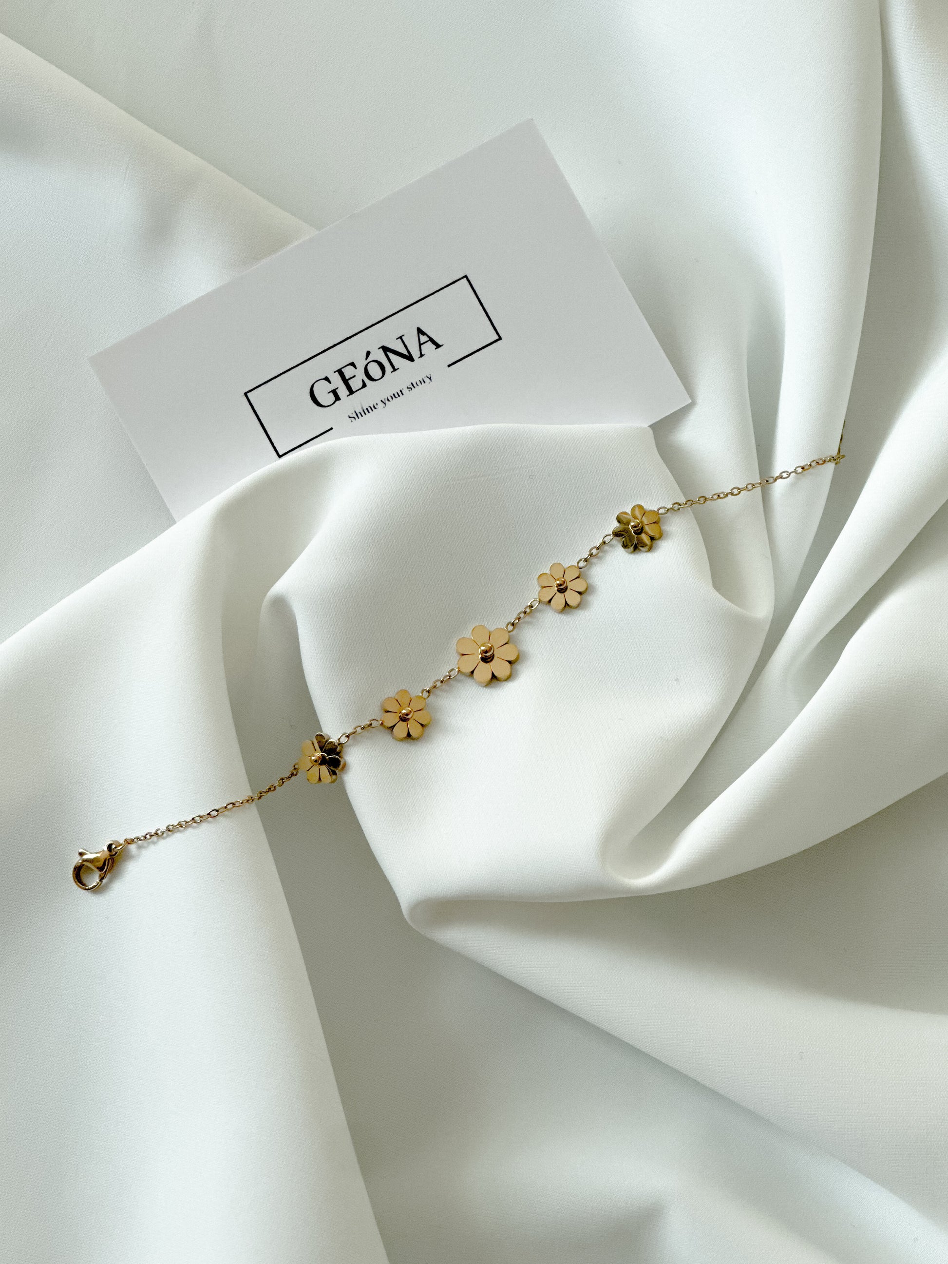Sculpted in radiant stainless steel with a rich gold-tone finish, this adjustable bracelet features five delicate floral elements — symbols of harmony, femininity, and light. Its refined design wraps your wrist with timeless charm, ready to elevate both daily looks and elegant evenings.