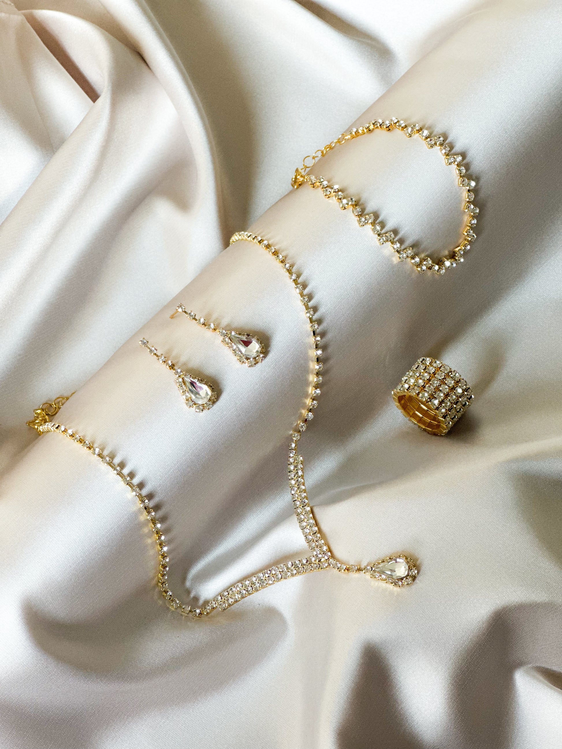 Composed of four perfectly balanced pieces — an adjustable necklace, adjustable bracelet, universal-size ring, and classic stud earrings — each element is meticulously crafted from premium stainless steel and finished in a radiant gold tone, adorned with brilliant-cut diamond simulants.